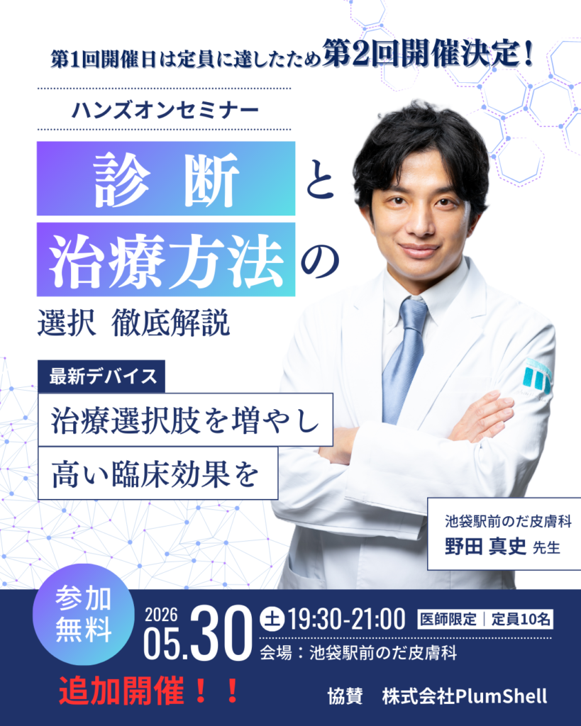 この度、ニキビ跡治療の分野で圧倒的な症例数と知見を持ち、最近では海外学会でも多数のご講演を行われている池袋駅前のだ皮膚科 院長 野田真史先生を講師にお招きし、ニキビ跡治療の「最適解」を導き出す特別なハンズオンセミナーを開催いたします。