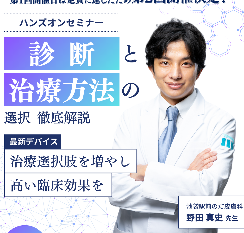 この度、ニキビ跡治療の分野で圧倒的な症例数と知見を持ち、最近では海外学会でも多数のご講演を行われている池袋駅前のだ皮膚科 院長 野田真史先生を講師にお招きし、ニキビ跡治療の「最適解」を導き出す特別なハンズオンセミナーを開催いたします。